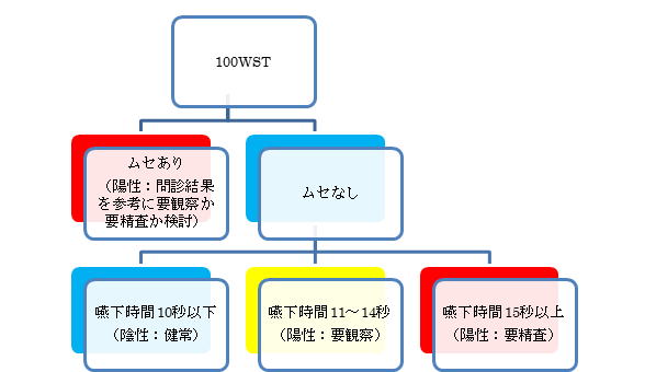 特に問診に「はい」と答える場合で100WSTでも要精査の場合については、自覚的にも他覚的にも異常があると考え、主治医への連絡および専門の医療機関(歯科や耳鼻咽喉科)への受診勧奨をすべきです。